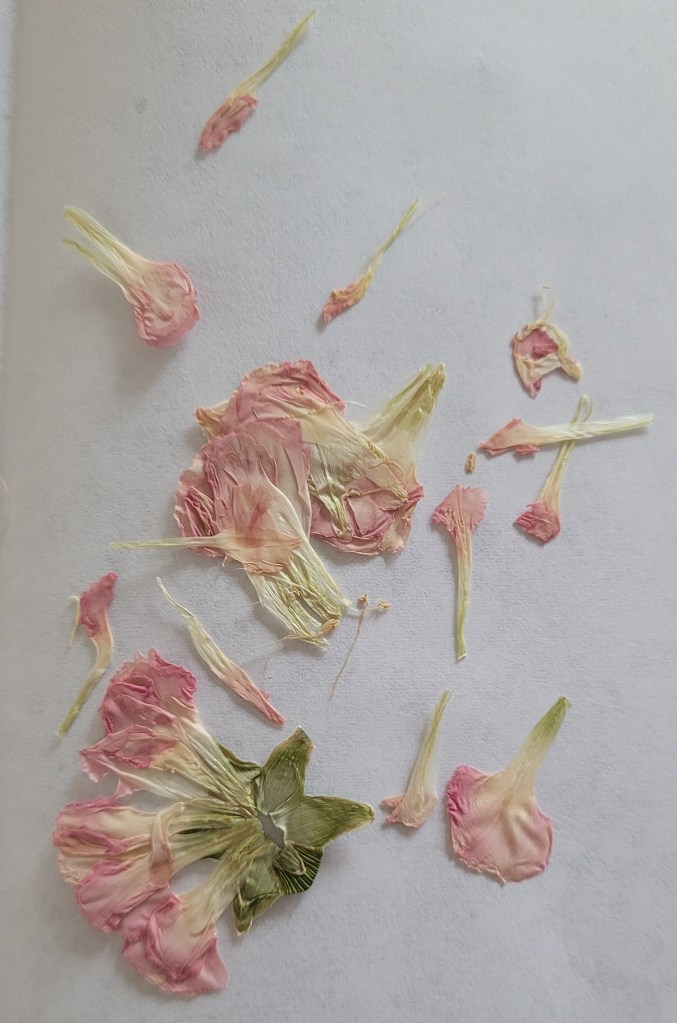 This is technically my second attempt at pressing flowers. In my first attempt the instructions I read online told me to change the paper after two days and then leave them to press for two weeks. Unfortunately the flower had too much water still in the petals after those first two days so leaving it for two weeks just made it go brown. So this time I consistently changed the paper every two days. You’ll notice that this flower did not stay intact. During one of the transfers to fresh paper the flower got jostled and half the petals fell out. Options for the future are to cut the flower in half, which will help it lay flat without twisting the petals and allows me to grab the halves by the green part when transferring, or I can choose to press flowers that have larger petals so I can press them individually.