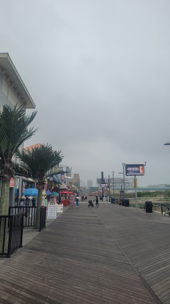 After acquiring the needed new clothes, my partner and I have some time to explore. We were having lunch at the Rainforest Cafe in Atlantic City so we walked the boardwalk and the beach for a bit. It was a pretty dreary day out, but I love the beach in all it’s forms so I was happy. My partner tolerates the beach, but was happy that I was happy.